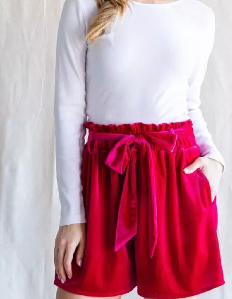 Velvet paper bag shorts with self-tie belted waistline and side pockets (non-sheer, lightweight)