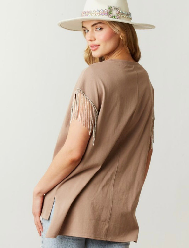 Mocha  "Free Bird" rhinestone fringe top, over sized with embellished sleeves, high low hem, and round neck.